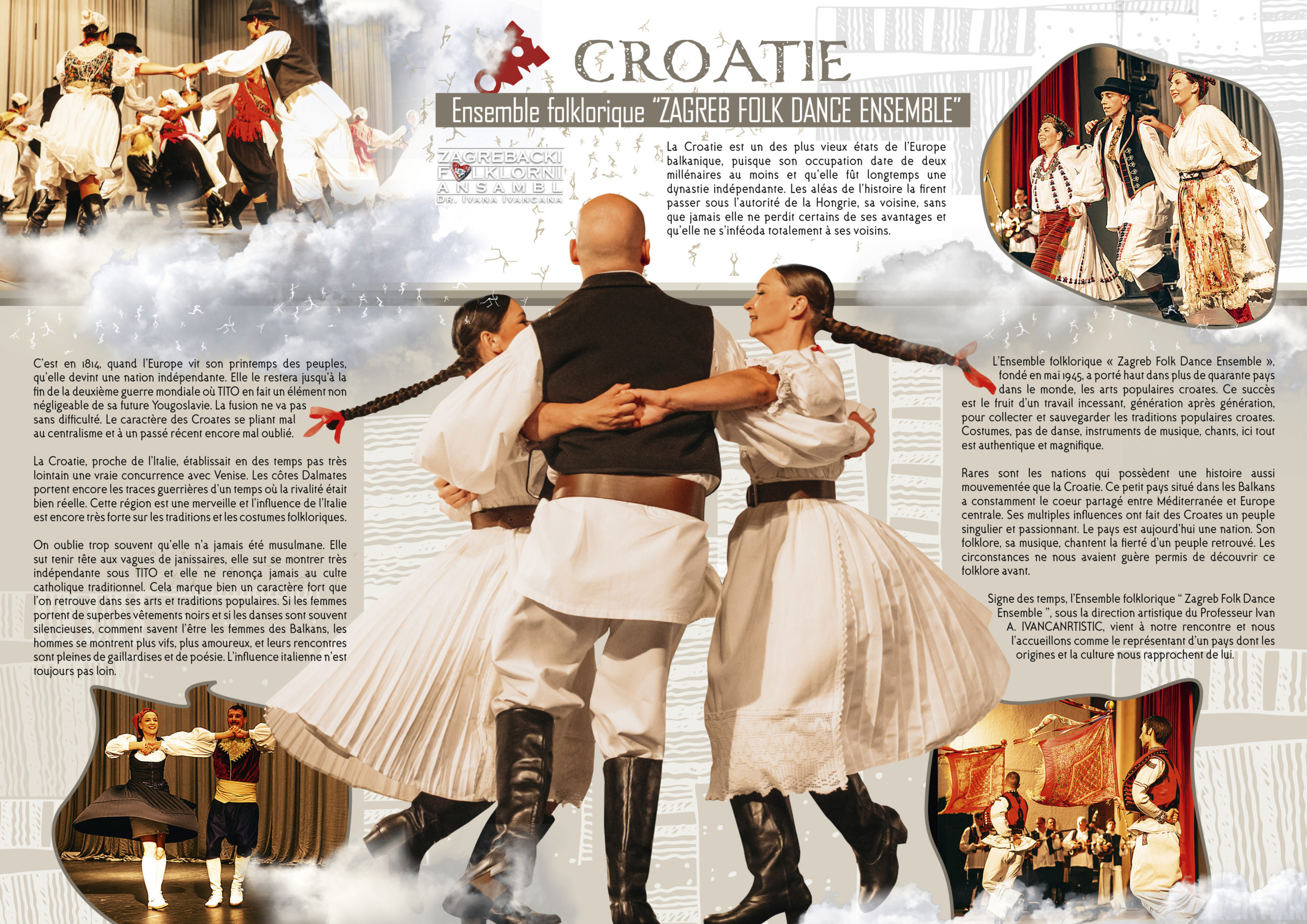 L’Ensemble folklorique « Zagreb Folk Dance Ensemble », fondé en mai 1945, a porté haut dans plus de quarante pays dans le monde, les arts populaires croates. Ce succès est le fruit d’un travail incessant, génération après génération, pour collecter et sauvegarder les traditions populaires croates. Costumes, pas de danse, instruments de musique, chants, ici tout est authentique et magnifique.